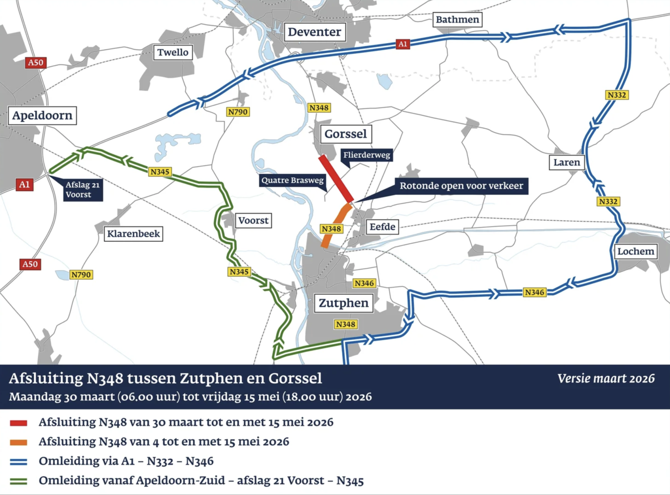 De Zutphenseweg (N348) tussen Gorssel en de rotonde bij Eefde is gedurende zeven weken afgesloten, terwijl het stuk tussen de rotonde bij Eefde en Zutphen anderhalve week dicht is. Om sluipverkeer door het centrum van Eefde te voorkomen, blijft de rijbaan tussen Gorssel en de rotonde bij Eefde tijdens beide fases afgesloten. De rotonde bij Eefde-Noord blijft wel toegankelijk.